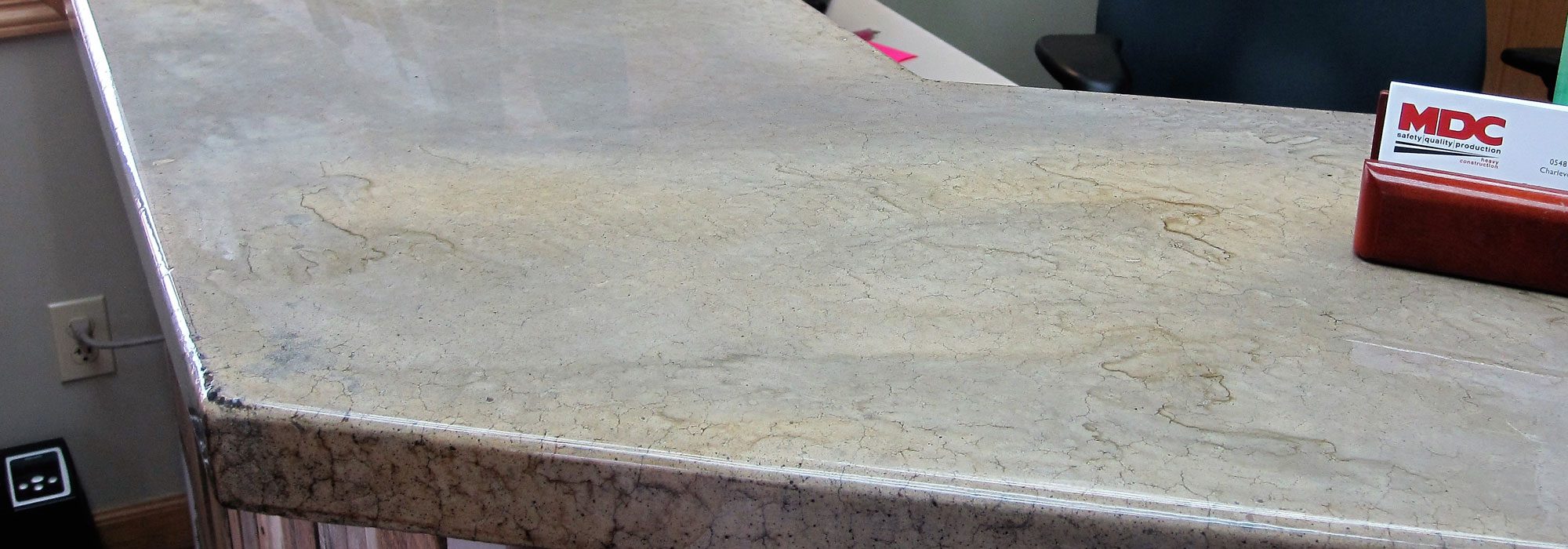 We crafted a new reception desk top using white concrete and transparent colors. A perfect fit for the front lobby of a concrete company.